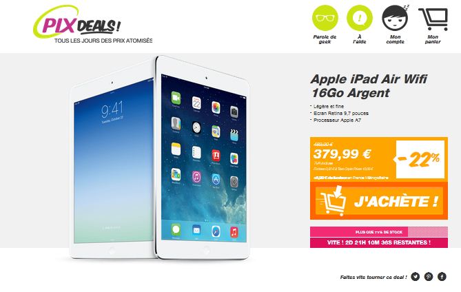 386 euros port inclus l'ipad air 16go wifi sur pixmania , dans les pixdeal ... (sorte de vente flash ) Ipad Air Wifi de couleur argent .. Voir l offre Vente ...