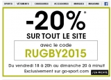 Une réduction chez go sport encore : 20 pourcent de remise jusqu'au 20 septembre avec le code de réduction "RUGBY2015" ... Comme chaque fois un code qui ...