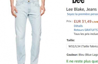 Toujours quelques bonnes affaires vetements quand on farfouille dans les soldes sur amazon .. Ainsi on y trouve encore un jean hommes de la marque Lee ...