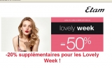 20 pourcent de réduction en plus pour l'achat de 3 articles de l'opération "lovely week" sur le site etam les 28 et 29 mars 2015 ... Il faut saisir le code ...