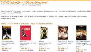 Offre interessante si vous desirez completer votre dvd-theque : sur amazon, pour 3 dvd achetés on a 10 euros de remise immediate .. Les dvd etant à choisir parmi des centaines ..