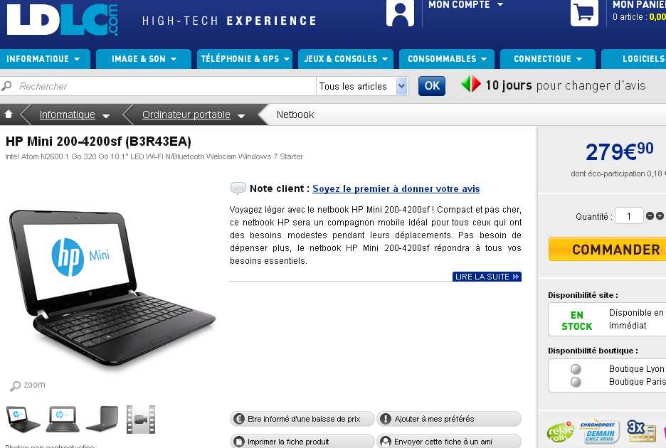 le hp mini 200-4200sf dispose d’un processeur atom 2600 à 1.6 ghz, de 1go de mémoire vive , d’un écran 10,1 pouces et d’un disque dur de 320go