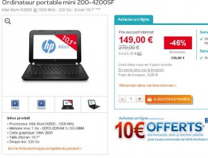 En effet il y a le mini pc HP Mini 200-4200SF en promo à 149 euros … Qui coute normalement au moins 100 euros de plus ( il est vendu pres de 280 euros chez ldlc ) ..