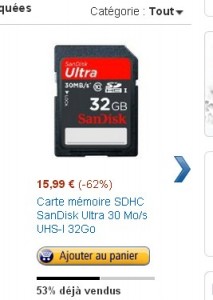 Besoin d’une bonne carte mémoire SD rapide pour votre appareil photos ou camescope ? Sur amazon en vente éclair le 4/12 on a une carte de 32go classe 10 de la marque Sandisk à 15.99 euros port inclus ..