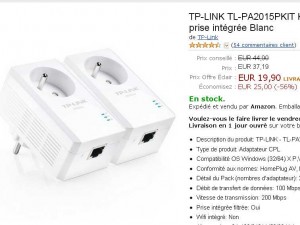 Et encore un bon prix pour des boitiers cpl sur amazon : en vente eclair le 29/08 on a un lot de deux plugs cpl de la marque tp link à 19.9 euros port inclu seulement ..