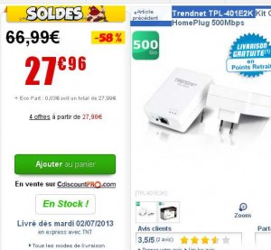boitiers cpl de la marque Trendnet .. qui n’ont malheureusement pas de prise femelle … Ils semblent se vendre ailleurs au mieux 10-15 euros plus chers .. on economise donc autour de 30%