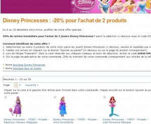 Encore une offre jouets qui peut etre interessante en prevision de noel pour des cadeaux à faire à des petites filles .. Sur amazon du 8 au 15 decembre, il y a 20% de remise immédiate pour l’achat de deux jouets « disney princesses » .. Il faut pour cela mettre les deux jouets désirés dans son panier et saisir le code promo « DISNEYPR » ..