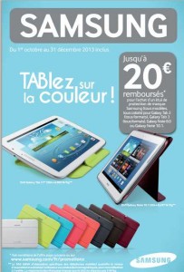 Vous avez une tablette Samsung Galaxy tab2 , Galaxy tab3 ou encore Galaxy note 8 ou 10 une offre peut vous interesser si vous n’avez pas de protection ou si celle que vous avez commence a être usée : samsung propose le remboursement de 20 euros sur l’achat d’un etui officiel de la marque destiné à l’une de ces tablettes ..