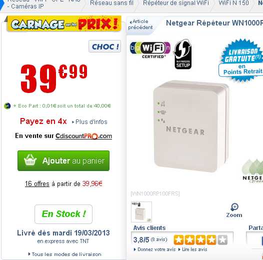 27.08 euros un repeteur Wifi de la marque netgear … jusqu’au 15 mars ..