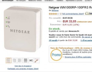 Le netgear WN1000RP-100FRS est déjà vendu à un super prix de 33.85 euros mais en plus on a 20 pourcent de remise supplementaire en saisissant le code promo « NETW1013 »