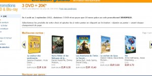 Si vous désirez completer votre collection de dvd , bonne affaire pour vous sur amazon jusqu’au 2 septembre : en effet sur plus d’une centaines de titres en tout genres, amazon propose une opération 3 DVD pour 20 euros ..