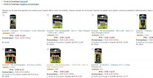 On peut notamment voir les piles stay charged duracell 1300 mah AA à 5.68 euros ou encore le chargeur 45mn + 4 piles stay charged à 20 euros ..