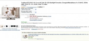 Si vous êtes à la recherche d’une tv 3d pas chère, peut etre qu’il sera interessant pour vous de jeter un oeil du coté d’amazon allemagne .. En effet on y trouve le téléviseur Toshiba 40TL933G pour 412.62 euros frais de livraison inclu pour la France (399 euros hors frais de livraison) ..