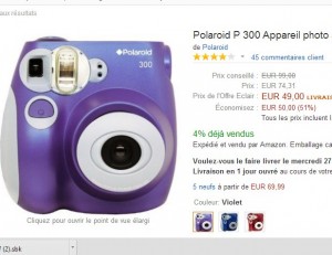 49 euros en vente éclair le 26 aout , l’appareil photos instantanées polaroid p300 sur amazon …