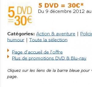 Pour bénéficier de l’offre , il faut donc mettre dans son panier les 5 titres désirés et saisir le code promo « 5DVD30EU » …