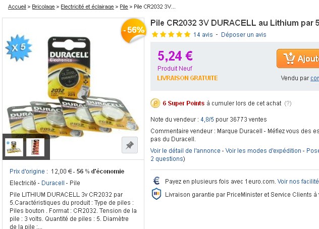 5.24 euros le lot de 5 piles duracell CR2032 … Soit donc un prix de revient de 1.05 euro par pile ..Interessant donc pour ces piles boutons que l’on trouve dans de nombreux appareils ( télecommandes notamment )