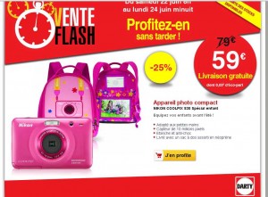 Si vous désirez offrir un appareil photo à une petite fille ou un petit garçon , il y a une vente flash qui peut sans doute vous interesser du coté de darty : pour 59 euros port inclu on a un appareil photo Nikon Coolpix S30 + un sac à dos .. Les deux etant roses ou bleus..