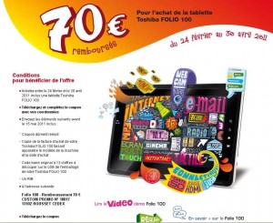 Si vous desirez vous offrir une tablette tactile grand format ( 10 pouces comme l’ ipad ) , voici une offre qui vous interessera peut etre : En effet pour l’achat de la tablette tactile Toshiba folio100 effectué di’ci le 30 avril 2011 , vous pourrez recevoir un remboursement différé de 70 euros .
