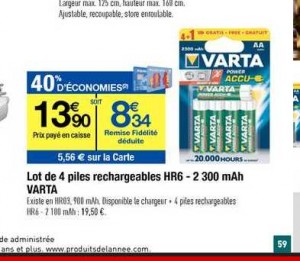 Bonne affaire pour des piles rechargeables chez carrefour jusqu’au 25 juin : en effet le lot de 5 piles AA varta 2300 mah est à 13.90 euros mais fait l’objet de 40% de credit sur la carte de fidélité .. Le prix de revient est donc de 8.4 euros seulement pour la boite ..