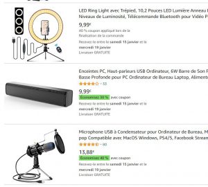 Sur Amazon, un vendeur tiers propose de nombreux coupons de réduction sur pas mal d’articles qu’il vend … Avec notamment plusieurs modeles d’anneaux lumineux , d’enceinte , de micro , de perche à selfie , des stations meteos ..