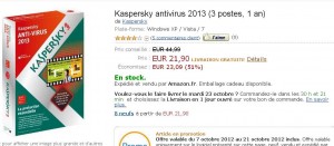 Antivirus Kaspersky 2013 3 postes / 1 an à 21.90 euros .. dernier jour