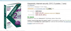 Bonne affaire pour l’antivirus kaspersky internet security 2012 3 postes / 2 ans .. En effet alors qu’il semble être vendu au moins 40 euros un peu partout (40.38 sur le site de la fnac ,69.99 chez surcouf ) , sur amazon il est en vente flash à 29 euros ..