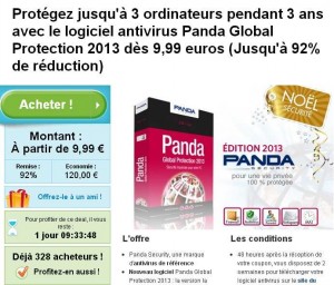Besoin d’un antivirus ? Sur groupon est à nouveau proposé la solution complete de Panda à savoir Panda Global Protection 2013 avec un prix de seulement 9.99 euros pour 1 poste et 3 ans de protection , 12.99 pour 2 postes et 15.99 pour 3 postes ..
