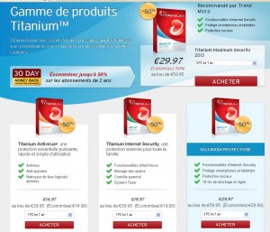 Offre interessante sur le site officiel des antivirus Titanium de trend micro avec 50% de remise sur les licences.. Ainsi l’antivirus Titanium Antivirus + est proposé 14.97 euros pour 1pc / 1an , 19.97 pour 1pc/2 ans ou 19.97 pour 3pc/1an ..