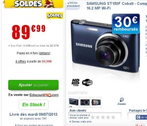 Bonne affaire sur cdiscount pour un appareil photo wifi samsung 150F .. En effet le modele bleu est vendu en solde 89 euros contre plutot autour de 100 – 130 euros mais en plus samsung offre 30 euros de remboursement en différé.. Cela va donc faire un prix de revient de moins de 60 euros ..