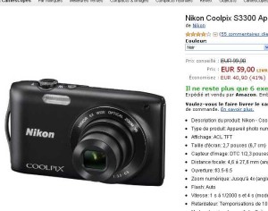 Si vous etes à la recherche d’un appareil photo numerique compact pas cher mais avec une bonne resolution et un zoom un peu plus elevé que ceux dans la meme gamme de prix , offre interessante du coté d’amazon : On trouve en effet le nikon coolpix s3300 à 59 euros port inclu .. Appareil photo avec capteur de 16 millions de pixels, zoom optique x6 … Appareil photo avec batterie (et pas des piles )