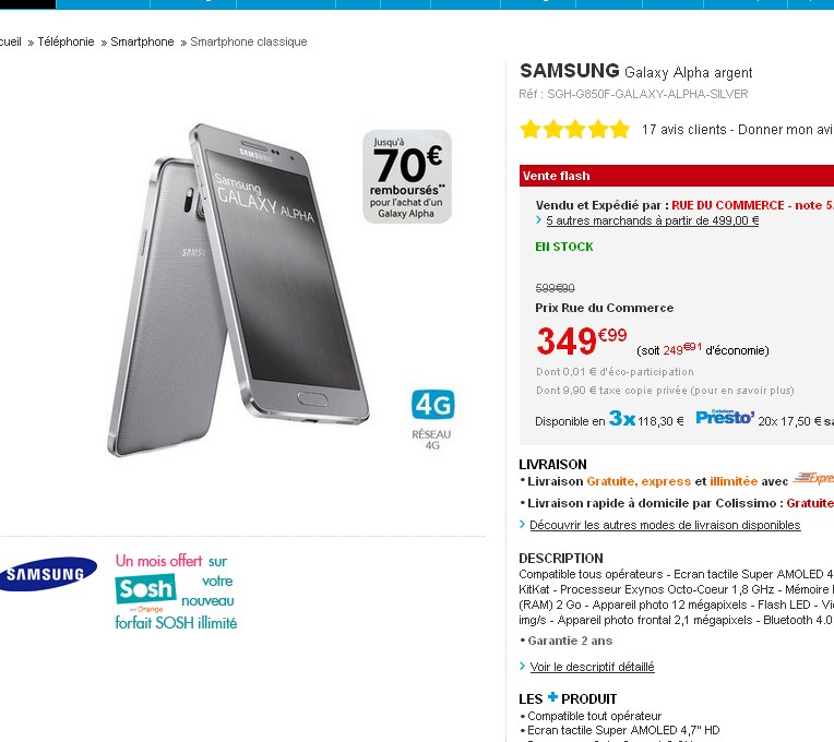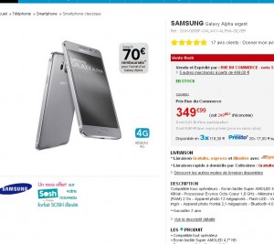 Baisse de prix sur le smartphone Samsung Galaxy Alpha que l’on peut voir proposé à 349 euros chez rueducommerce …