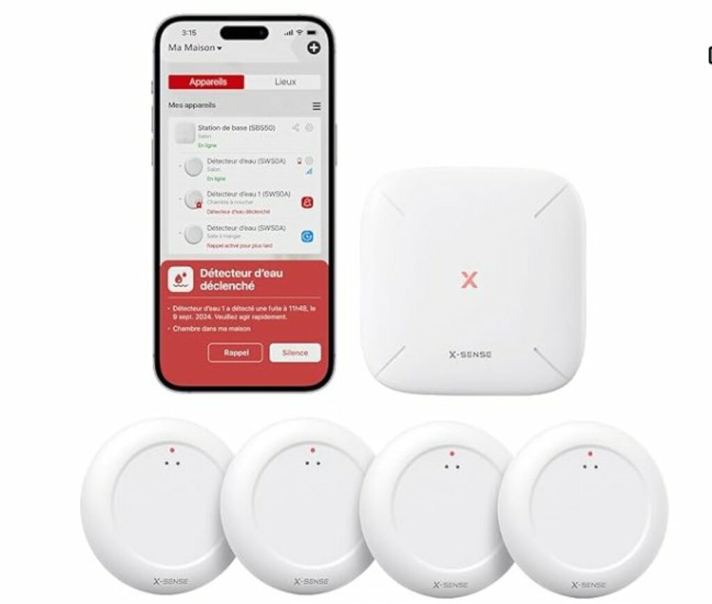 Alarmes Centralisées : En cas de détection d’eau, le témoin LED du capteur clignote en rouge, tandis que l’alarme est émise uniquement par la base. Si vous souhaitez une alarme simultanée sur le capteur et la base, optez pour le kit Wi-Fi X-Sense SWS54 pour une protection renforcée.