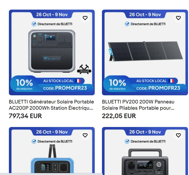 Sur Ebay , on peut voir la marque BLUETTI qui propose de nombreux modeles de stations d’énergies mobiles de sa gamme .. A la fois des stations neuves mais aussi des reconditionnées .. Sur ces dernieres il y a de tres grosses réductions par rapport au prix du neuf …