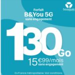 Une des meilleures offres du moment pour un forfait mobile proposant la 5G avec un volume conséquent de datas , c’est Bouygues qui le propose avec un forfait B&You sans engagement en serie limité qui offre pour 9.99€ / mois :