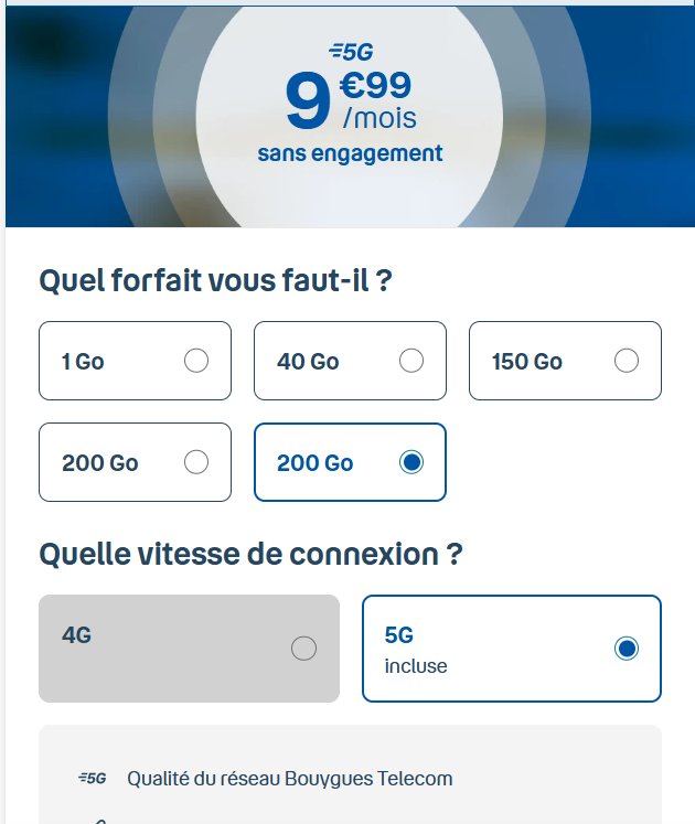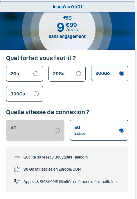 Voici bonne promotion pour s’abonner à un forfait mobile 5G et sans engagement sur un réseau mobile normalement reputé pour sa qualité : Bouygues !