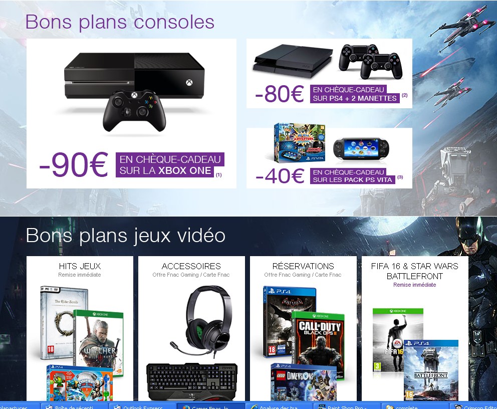On peut voir par exemple la xbox one à 399 euros sur laquelle on récupère 90 euros de chèque cadeaux … Le pack console sony ps4 + 2 manettes à 458 euros sur lequel on récupere 80 euros de bons d’achats ..