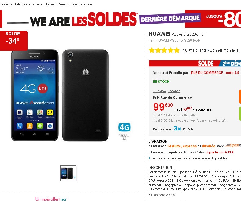 Bon prix pour un smartphone avec des caractéristiques sympa : 99.99 euros l’huawei g620 : smartphone android 5 pouces HD ( 1280 x 720 ) , 4G , quad core, 1go de ram, 8go d’espace de stockage extensible ; appareil photos dorsal de 8 millions de pixels, frontal de 2 millions de pixels ..