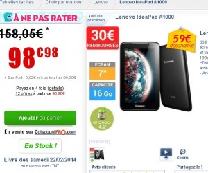A la recherche d’un bon plan pour une tablette tactile 7 pouces correcte et pas trop chère ? Jusqu’au 28 fevrier il y a l’offre de remboursement de 30 euros de la part de Lenovo sur sa tablette ideatab A1000 .. Une tablette android 7 pouces tout à fait correcte avec processeur dual core ,16go d’espace de stockage, 1go de mémoire vive ..