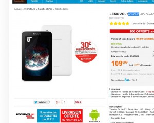 Bon plan pour une tablette 8 pouces avec une offre de remboursement … La lenovo A8-50 est à 109.9 euros jusqu’au 31/10 sur rueducommerce en utilisant le code de réduction « SCARY10 » … En plus lenovo rembourse 30 euros en différé , ca fait donc un prix de revient de 80 euros…