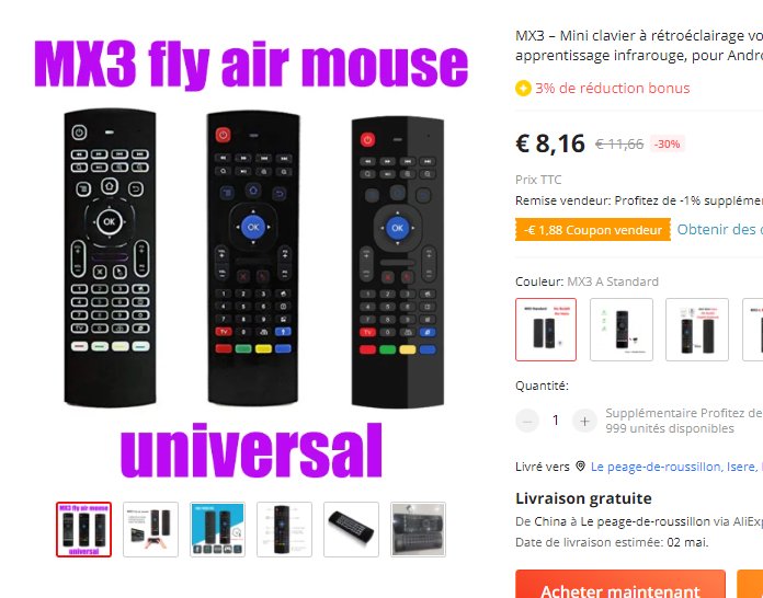 sur AliExpress, on peut voir un vendeur qui propose la telecommande MX3 pour seulement 8€ avec la livraison gratuite
