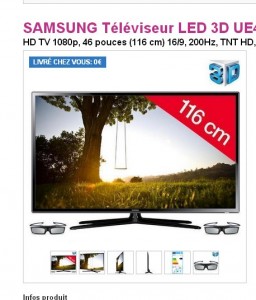 Super prix sur pixmania pour une tv 3d de 46 pouces : 492 euros seulement la samsung UE46F6100 .. Une Tv 3d avec un écran de 116 cm , livrée avec 2 paires de lunettes …