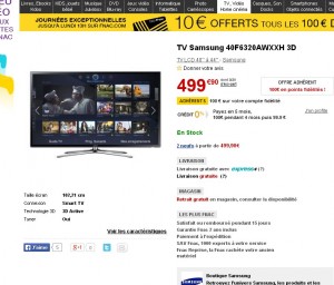 Une tv proposée à 499 euros mais qui fait l’objet de 100 euros de credit en bons d’achats pour les adherents fnac … La tv revient donc à 399 euros …