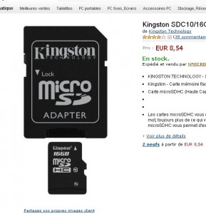 A la recherche de carte mémoire sd ou micro sd rapide pour votre camescope , appareil photo, tablette, smartphone ? Très bon prix sur amazon de la part d’un vendeur tiers, pour une carte mémoire micro sd de 16go de la marque kingston : 8.54 8.13 euros livraison incluse .. Une carte classe 10 donc rapide ..