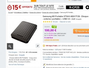 Un disque dur externe 2.5 pouces de grosse capacité (2to) à 85 euros sur priceminister le 20 mai … Le samsung M3 est vendue à 100 euros port inclus par un vendeur pro , mais on peut donc utiliser le code de réduction « R-CP25 » qui donne 15 euros de remise .. (code valable uniquement le 20 mai )