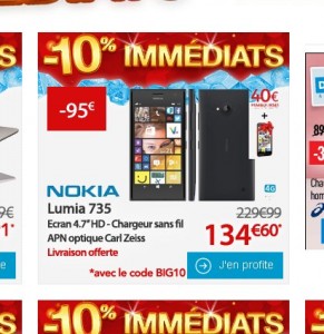 Le nokia lumia 735 est en promo sur rueducommerce à 174.60 euros (avec le code promo « BIG10 » ) et donc apres avoir recu son remboursement de 40 euros le prix de revient sera donc de 134.60 euros …