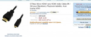 Vous avez un smartphone , une tablette ou un autre appareil disposant d’un port microhdmi et vous desirez le relier à votre tv ? A priori les cables micro hdmi – hdmi se trouvent generalement à un prix au delà de 10 euros, cependant sur amazon un vendeur tiers en propose pour moins de 6 euros port inclu ..