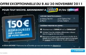 Une bonne affaire si vous desirez vous offrir une tablette tactile : en effet , Canal+ / canalsat offre 150 euros de remboursement différé sur l’achat d’une tablette ( Ipad2 , Galaxy Tab10 , Lg Optimus Pad, Sony Tablet S) à condition de s’abonner d’ici le 30 novembre soit à canal plus , soit à canalsat soit au deux ..