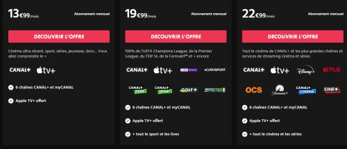 - 13.99€ le pack de base qui contient plusieurs chaines : Canalplus , Canalplus Grand Ecran , Canalplus Sport 360 , Canalplus Series , Canalplus Doc , Canalplus Kids et Apple Tv +