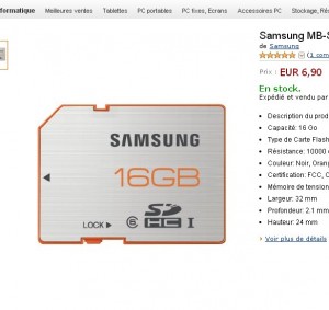 Encore une bonne affaire pour une carte mémoire : cette fois ci c’est une carte mémoire SD Samsung de 16go classe 6 vendue à moins de 7 euros livraison incluse .. 6.90 euros precisement par le vendeur tiers skybear sur amazon ..