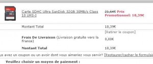 Vous avez besoin d’une carte mémoire sd de grande capacité et rapide pour votre appareil photo ou camescope ? Bonne affaire encore une fois sur zoombits .. En effet la carte sd sandisk de 32go classe 10 est à 21.64 euros port inclu .. Mais en passant le code promo sandisk15 , on gagne 15% sur le prix , et donc celui ci passe à 18.39 euros port inclu ..